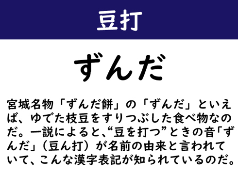 宮城名物「ずんだ餅」の「ずんだ」といえば、ゆでた枝豆をすりつぶした食べ物なのだ。一説によると、“豆を打つ”ときの音「ずんだ」(豆ん打)が名前の由来と言われていて、こんな漢字表記が知られているのだ。