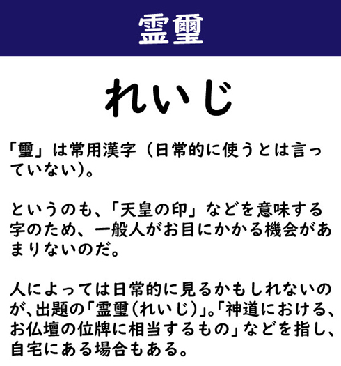 「璽」は常用漢字(日常的に使うとは言っていない)。というのも、「天皇の印」などを意味する字のため、一般人がお目にかかる機会があまりないのだ。人によっては日常的に見るかもしれないのが、出題の「霊璽(れいじ)」。「神道における、お仏壇の位牌に相当するもの」などを指し、自宅にある場合もある。