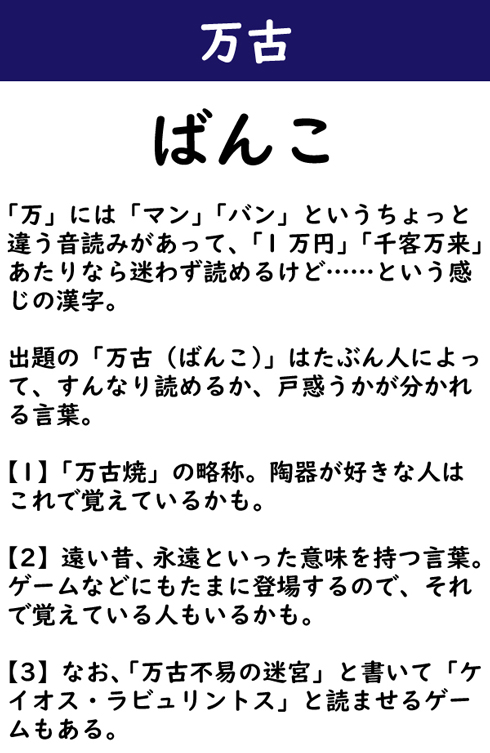 「万」には「マン」「バン」というちょっと違う音読みがあって、「1万円」「千客万来」あたりなら迷わず読めるけど……という感じの漢字。出題の「万古(ばんこ)」はたぶん人によって、すんなり読めるか、戸惑うかが分かれる言葉。【1】「万古焼」の略称。陶器が好きな人はこれで覚えているかも。【2】遠い昔、永遠といった意味を持つ言葉。ゲームなどにもたまに登場するので、それで覚えている人もいるかも。【3】なお、「万古不易の迷宮」と書いて「ケイオス・ラビュリントス」と読ませるゲームもある。