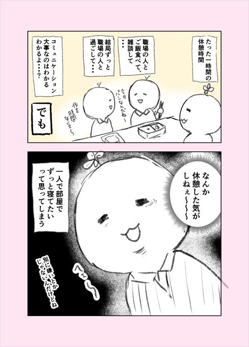 コミュニケーションが大事なのは分かっているし、同僚が嫌いなわけではないけれど、それでも「休憩した気がしねぇ〜」と思ってしまう八時さん。「一人で部屋でずっと寝てたい」というぼやきをつづっています。