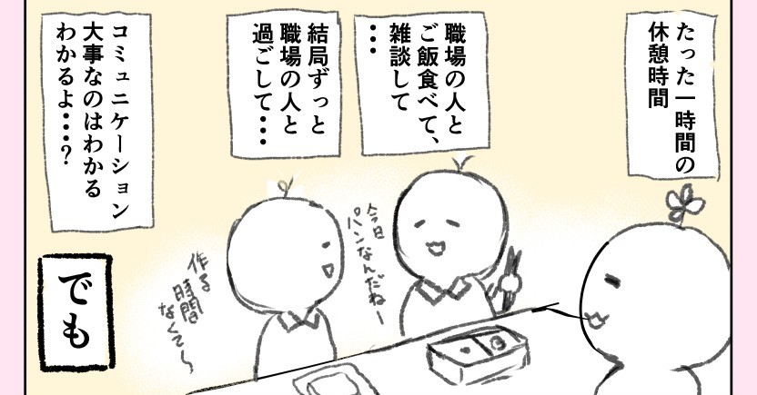漫画には「すっごく分かります!! 私も苦痛でした」「お昼を一人で食べたい派にはツライんだ」といった共感の声が多く寄せられました。「休憩中は音楽聞いて自分の世界に入ってる」「仮眠室あるからそこで寝てる」など自分だけの時間を作る対策をしている人も。またコロナ禍で個食・黙食推奨になり「楽になった」といったコメントもみられました。