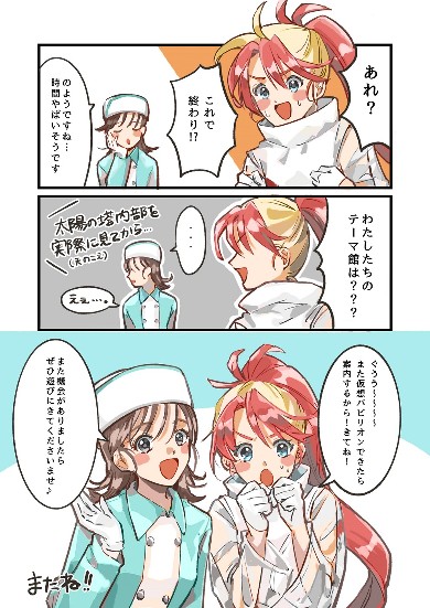 実はこのご本の製作期間は1週間ほどだそうで、取り上げられている施設は3館、まだまだこれから描きたい部分があるとのこと。しかし、フルカラーのイラストはカラフルで華やか、イラストを挟んで前後にある説明のマンガもかわいらしく、短い製作期間での勢いと、見せたいところをきちんと両立して提示されています。わくわくするポイントが「注目した部分はここ」「こんな展開だったりして」とページのなかに織り込まれ、イラストでも、文章でも伝わってきます。大好きの表現の仕方として過去に浸っただけでなく、もう一歩自分なりに踏み出して構築したところに、かわいらしい画風が相まって、やわらかな明るさを感じました。