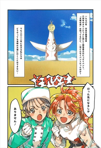 作者さんは1970年開催の大阪万博に行ったことなく、その跡地である万博記念公園内の施設、「EXPO’70パビリオン」を訪れたことで、この催しのことが大好きになったのだそうです。しかしどんなに行ってみたくても、会期は50年以上前に終わっています……。行先を失ったエネルギーを、作者さんは「行ったつもりになって夢想・妄想する」という手段で発散することにします。