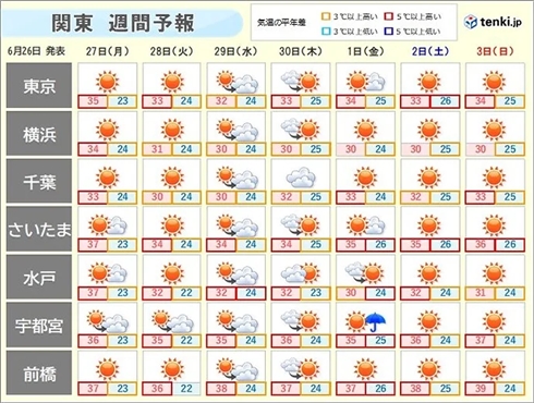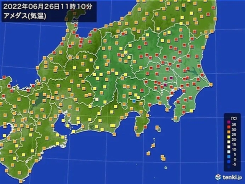 きょう26日は、本州付近は、夏の空気に覆われています。関東では、晴れている所が多く、気温がグンと上がっています。東京都心では、午前11時15分ごろ、気温が35℃を超えました。きのう25日の東京都心の最高気温は35.4℃で、2日連続の猛暑日です(猛暑日は最高気温が35℃以上の日)。東京都心で6月に猛暑日になるのは、統計開始の1875年以降、5回目で、2日連続したのは初めてです。