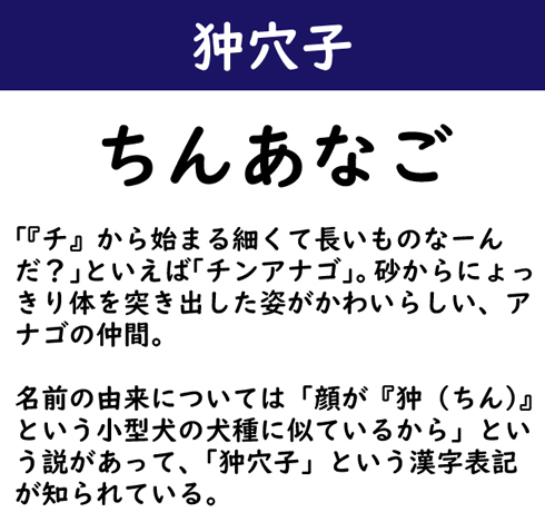 「『チ』から始まる細くて長いものなーんだ?」といえば「チンアナゴ」。砂からにょっきり体を突き出した姿がかわいらしい、アナゴの仲間。名前の由来については「顔が『狆(ちん)』という小型犬の犬種に似ているから」という説があって、「狆穴子」という漢字表記が知られている。