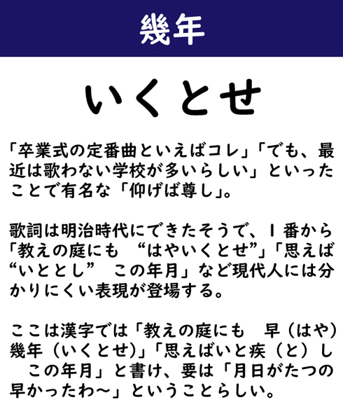 「卒業式の定番曲といえばコレ」「でも、最近は歌わない学校が多いらしい」といったことで有名な「仰げば尊し」。歌詞は明治時代にできたそうで、1番から「教えの庭にも “はやいくとせ”」「思えば“いととし” この年月」など現代人には分かりにくい表現が登場する。ここは漢字では「教えの庭にも 早(はや)幾年(いくとせ)」「思えばいと疾(と)し この年月」と書け、要は「月日がたつの早かったわ〜」ということらしい。
