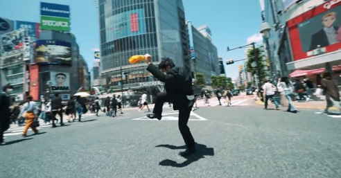 スクランブル交差点でサラリーマンが踊る場面(画像はCMから)