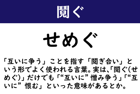「互いに争う」ことを指す「鬩ぎ合い」という形でよく使われる言葉。実は、「鬩ぐ(せめぐ)」だけでも「“互いに”憎み争う」「“互いに”恨む」といった意味があるとか。