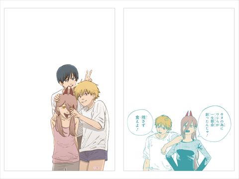 オリジナルフード・ドリンクは、「ブラッドオレンジミックス」(198円)、「マグカップ&みかんゼリー」(678円)、ミニ色紙入り「チェンソーマン カントリーマアムココア」(700円)が登場。またローソン店頭・@Loppi・HMV&BOOKS online 限定で付箋(550円)、A4クリアファイル3枚セット(1100円)、アクリルスタンド(1320円)を販売するほか、@Loppi・HMV&BOOKS online限定商品として「ジオラマアクリルスタンド」(2200円)、「Tシャツ」(3850円)、ビッグタオル(4400円)が登場します。
