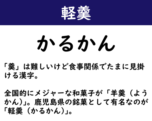 「羹」は難しいけど食事関係でたまに見掛ける漢字。全国的にメジャーな和菓子が「羊羹(ようかん)」。鹿児島県の銘菓として有名なのが「軽羹(かるかん)」。