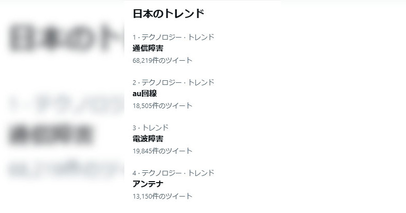 Twitterでは「通信障害」「au回線」「電波障害」「アンテナ」など多数の関連ワードがトレンドに。音声通話ができず知人や家族と連絡ができない、出先で通信ができず外出できない、二段階認証でSMSが届かずサービスにログインできない声もあがっており、復旧が待たれます。
