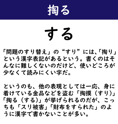 「問題のすり替え」の“すり”には、「掏り」という漢字表記があるという。書くのはそんなに難しくないのだけど、使いどころが少なくて読みにくい字だ。というのも、他の表現としては一応、身に着けている金品などを盗む「掏摸(すり)」「掏る(する)」が挙げられるのだが、こっちも「スリ被害」「財布をすられた」のように漢字で書かないことが多い。