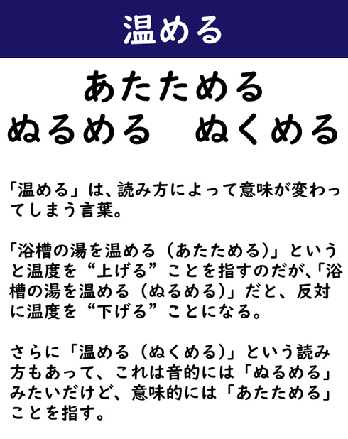「温める」は、読み方によって意味が変わってしまう言葉。「浴槽の湯を温める(あたためる)」というと温度を“上げる”ことを指すのだが、「浴槽の湯を温める(ぬるめる)」だと、反対に温度を“下げる”ことになる。さらに「温める(ぬくめる)」という読み方もあって、これは音的には「ぬるめる」みたいだけど、意味的には「あたためる」ことを指す。