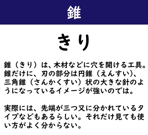 錐(きり)は、木材などに穴を開ける工具。錐だけに、刃の部分は円錐(えんすい)、三角錐(さんかくすい)状の大きな針のようになっているイメージが強いのでは。実際には、先端が三つ又に分かれているタイプなどもあるらしい。それだけ見ても使い方がよく分からない。