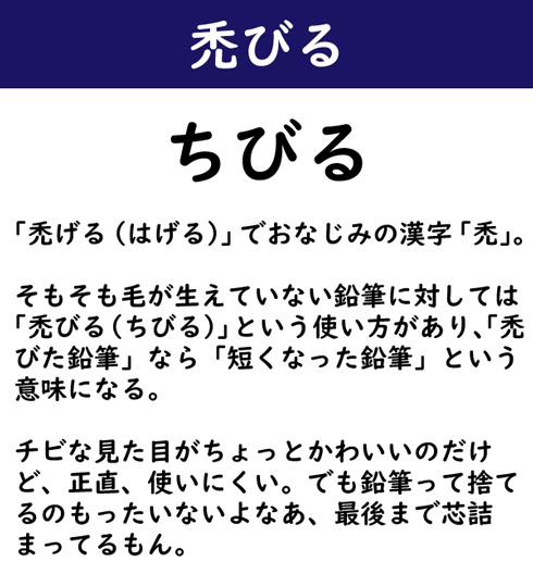 「禿げる(はげる)」でおなじみの漢字「禿」。そもそも毛が生えていない鉛筆に対しては「禿びる(ちびる)」という使い方があり、「禿びた鉛筆」なら「短くなった鉛筆」という意味になる。チビな見た目がちょっとかわいいのだけど、正直、使いにくい。でも鉛筆って捨てるのもったいないよなあ、最後まで芯詰まってるもん。