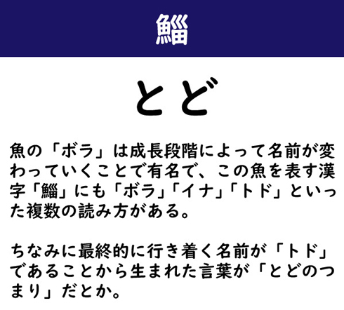 魚の「ボラ」は成長段階によって名前が変わっていくことで有名で、この魚を表す漢字「鯔」にも「ボラ」「イナ」「トド」といった複数の読み方がある。ちなみに最終的に行き着く名前が「トド」であることから生まれた言葉が「とどのつまり」だとか。