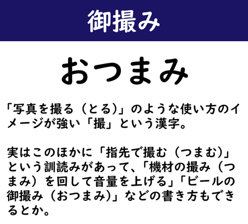 「写真を撮る(とる)」のような使い方のイメージが強い「撮」という漢字。実はこのほかに「指先で撮む(つまむ)」という訓読みがあって、「機材の撮み(つまみ)を回して音量を上げる」「ビールの御撮み(おつまみ)」などの書き方もできるとか。