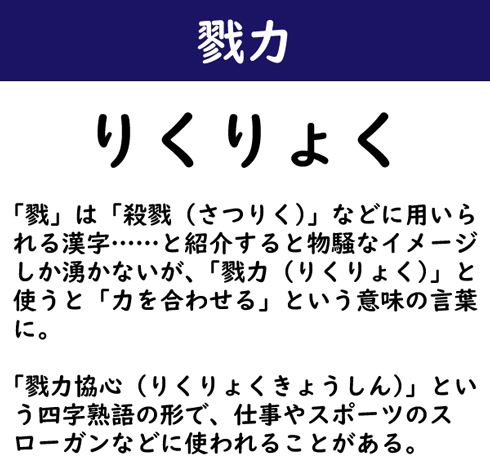 「戮」は「殺戮(さつりく)」などに用いられる漢字……と紹介すると物騒なイメージしか湧かないが、「戮力(りくりょく)」と使うと「力を合わせる」という意味の言葉に。「戮力協心(りつりょくきょうしん)」という四字熟語の形で、仕事やスポーツのスローガンなどに使われることがある。