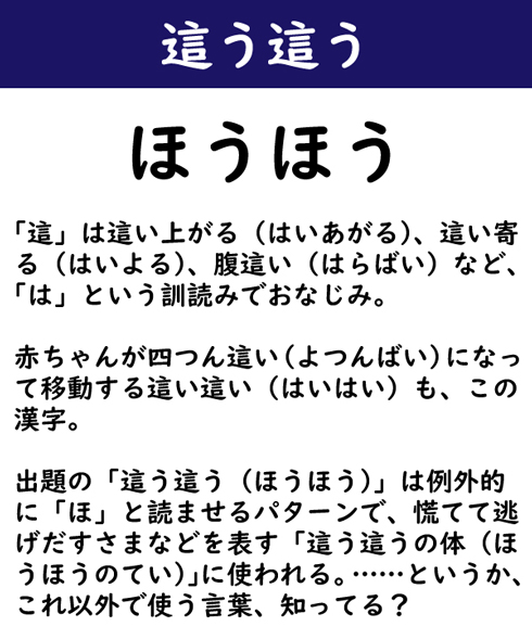 「這」は這い上がる(はいあがる)、這い寄る(はいよる)、腹這い(はらばい)……など、「は」という訓読みでおなじみ。赤ちゃんが四つん這い(よつんばい)になって移動する這い這い(はいはい)も、この漢字。出題の「這う這う(ほうほう)」は例外的に「ほ」と読ませるパターンで、慌てて逃げだすさまなどを表す「這う這うの体(ほうほうのてい)」に使われる。