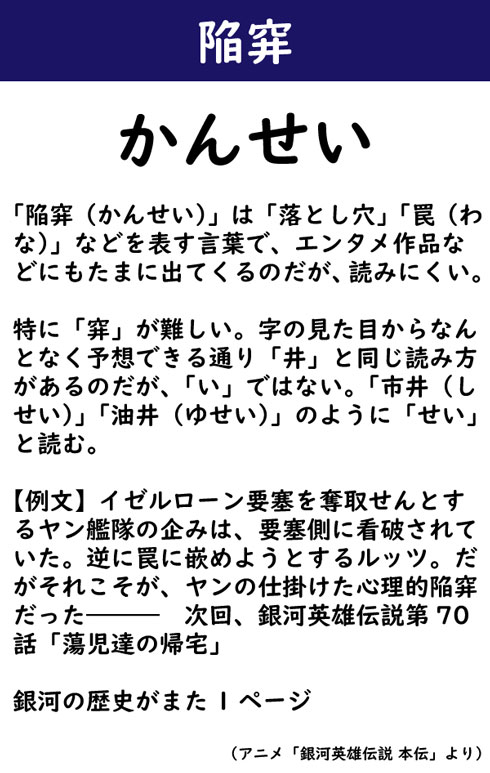 「陥穽(かんせい)」は「落とし穴」「罠(わな)」などを表す言葉で、エンタメ作品などにもたまに出てくるのだが、読みにくい。特に「穽」が難しい。字の見た目からなんとなく予想できる通り「井」と同じ読み方があるのだが、「い」ではない。「市井(しせい)」「油井(ゆせい)」のように「せい」と読む。【例文】イゼルローン要塞を奪取せんとするヤン艦隊の企みは、要塞側に看破されていた。逆に罠に嵌めようとするルッツ。だがそれこそがヤンの仕掛けた心理的陥穽だった。次回、銀河英雄伝説第70話「蕩児達の帰宅」。銀河の歴史がまた1ページ。(アニメ「銀河英雄伝説 本伝」より)