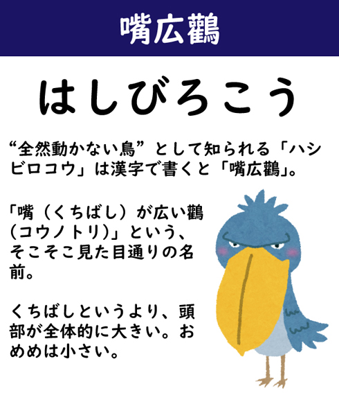 “全然動かない鳥”として知られる「ハシビロコウ」は漢字で書くと「嘴広鸛」。「嘴(くちばし)が広い鸛(コウノトリ)」という、そこそこ見た目通りの名前。くちばしというより、頭部が全体的に大きい。おめめは小さい。