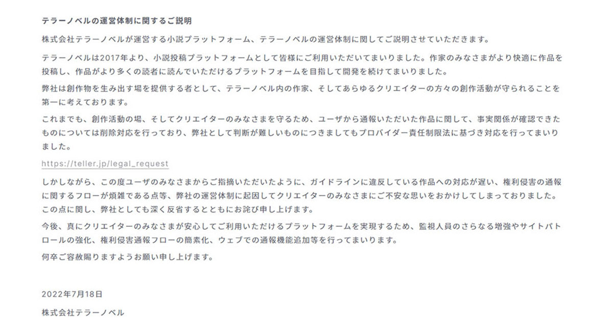 運営が発表した謝罪文(引用:テラーノベルの運営体制に関するご説明