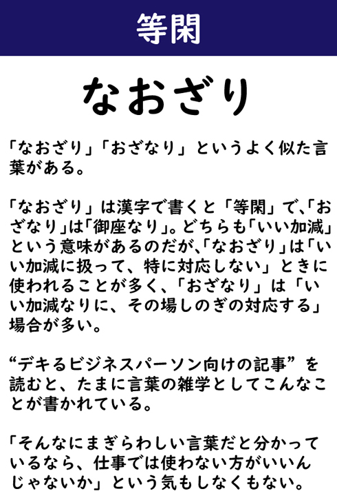「なおざり」「おざなり」というよく似た言葉がある。「なおざり」は漢字で書くと「等閑」で、「おざなり」は「御座なり」。どちらも「いい加減」という意味があるのだが、「なおざり」は「いい加減に扱って、特に対応しない」ときに使われることが多く、「おざなり」は「いい加減なりに、その場しのぎの対応する」場合が多い―― “デキるビジネスパーソン向けの記事”を読むと、たまに言葉の雑学としてこんなことが書かれている。「そんなにまぎらわしい言葉だと分かっているなら、仕事では使わない方がいいんじゃないか」という気もしなくもない。