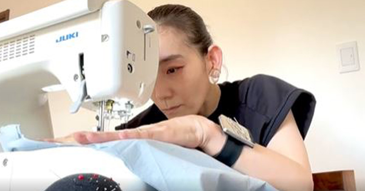 シャツワンピースを制作している篠原さん(画像は篠原ともえInstagramから)