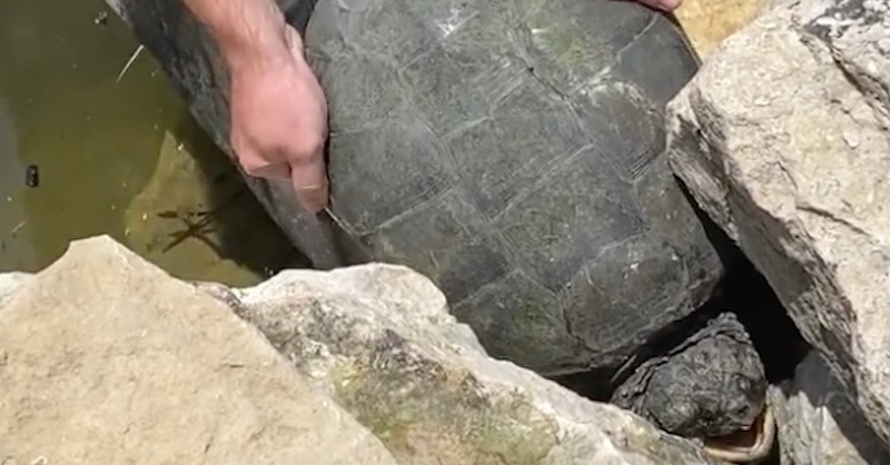 動画は米オハオハ州ダブリンで撮影されました。この日、撮影者さんが住む団地のプールデッキに亀が迷い込んだそうです。そこで撮影者さんたちは亀を池へ戻そうと誘導していたのですが、岩の隙間に亀が落ちてしまったんだとか。