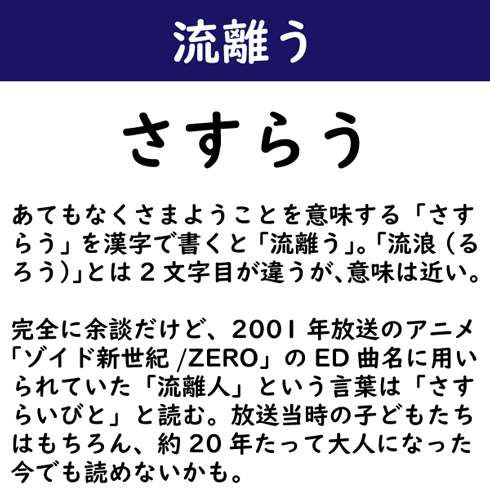 あてもなくさまようことを意味する「さすらう」を漢字で書くと「流離う」。「流浪(るろう)」とは2文字目が違うが、意味は近い。完全に余談だけど、2001年放送のアニメ「ゾイド新世紀/ZERO」のED曲名に用いられていた「流離人」という言葉は「さすらいびと」と読む。放送当時の子どもたちはもちろん、約20年たって大人になった今でも読めないかも。