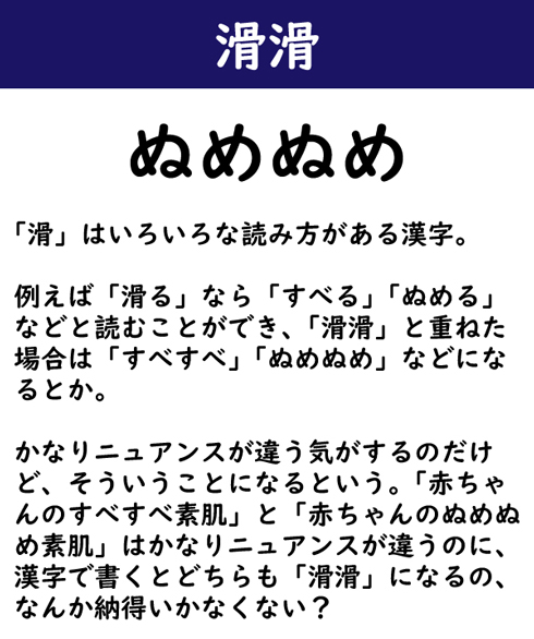 「滑」はいろいろな読み方がある漢字。例えば「滑る」なら「すべる」「ぬめる」などと読むことができ、「滑滑」と重ねた場合は「すべすべ」「ぬめぬめ」などになるとか。かなりニュアンスが違う気がするのだけど、そういうことになるという。「赤ちゃんのすべすべ素肌」と「赤ちゃんのぬめぬめ素肌」はかなりニュアンスが違うのに、漢字で書くとどちらも「滑滑」になるの、なんか納得いかなくない?