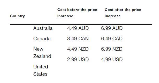 値上げは新規加入者に対してタイムゾーンによって7月27日から28日から適用されます。既に加入しているユーザーは、新料金適用の少なくとも30日前にTwitterか決済会社から通知が来るまでは現行の料金のままとなります。