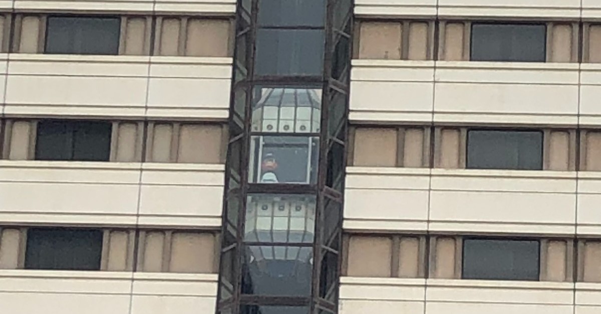 ハードオフ公式アンバサダーを務め、バンド「サンライズ」で活動するましこ(@mashashico)さんがとらえて投稿した場面。建物の外から撮影したシースルーエレベーターの中に、よく見るとスワローズのマスコット、つば九郎が。