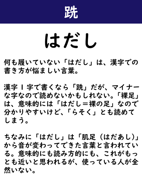 何も履いていない「はだし」は、漢字での書き方が悩ましい言葉。漢字1字で書くなら「跣」だが、マイナーな字なので読めないかもしれない。「裸足」は、意味的には「はだし=裸の足」なので分かりやすいけど、「らそく」とも読めてしまう。ちなみに「はだし」は「肌足(はだあし)」から音が変わってできた言葉と言われている。意味的にも読み方的にも、これがもっとも近いと思われるが、使っている人が全然いない。