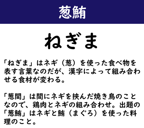「ねぎま」はネギ(葱)を使った食べ物を表す言葉なのだが、漢字によって組み合わせる食材が変わる。「葱間」は間にネギを挟んだ焼き鳥のことなので、鶏肉とネギの組み合わせ。出題の「葱鮪」はネギと鮪(まぐろ)を使った料理のこと。