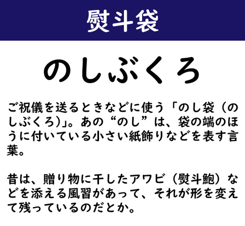 ご祝儀を送るときなどに使う「のし袋(のしぶくろ)」。あの“のし”は、袋の端のほうに付いている小さい紙飾りなどを表す言葉。昔は、贈り物に干したアワビ(熨斗鮑)などを添える風習があって、それが形を変えて残っているのだとか。