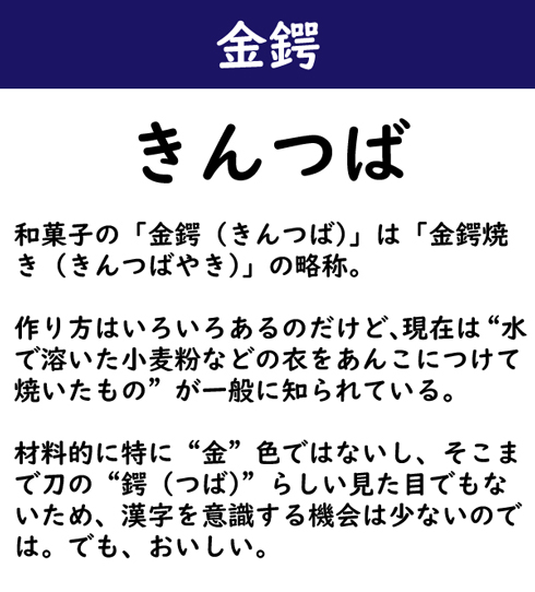 和菓子の「金鍔(きんつば)」は「金鍔焼き(きんつばやき)」の略称。作り方はいろいろあるのだけど、現在は“水で溶いた小麦粉などの衣をあんこにつけて焼いたもの”が一般に知られている。材料的に特に“金”色ではないし、そこまで刀の“鍔(つば)”らしい見た目でもないため、漢字を意識する機会は少ないのでは。でも、おいしい。