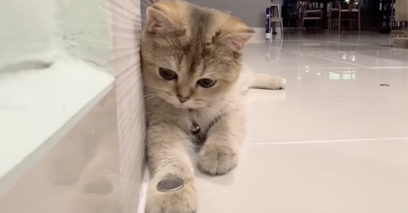 海外で撮影された動画に映るのはブリティッシュショートヘアの猫ちゃんと飼い主さんの手。飼い主さんの手の上にはコインが乗っています。