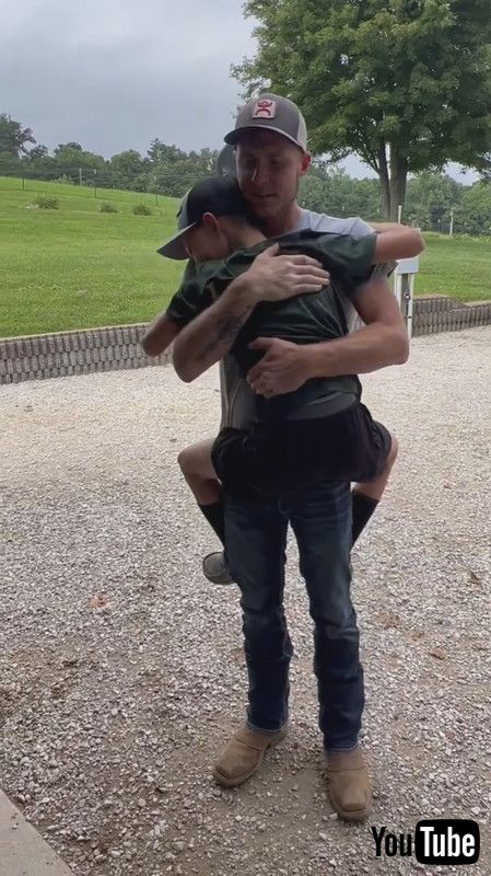 そして顔いっぱいに笑顔を浮かべると、後ろに立つパパに駆け寄って飛びつき、ぎゅっと抱きしめました。とめどなく涙があふれ、泣きじゃくる男の子。うれしさ伝わるハグに、パパは息子の背中を優しくポンポンとたたきます。