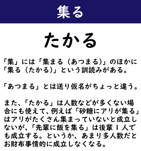 「集」には「集まる(あつまる)」のほかに「集る(たかる)」という訓読みがある。「あつまる」とは送り仮名がちょっと違う。また、「たかる」は人数などが多くない場合にも使えて、例えば「砂糖にアリが集る」はアリがたくさん集まっていないと成立しないが、「先輩に飯を集る」は後輩1人でも成立する。というか、あまり多人数だとお財布事情的に成立しなくなる。