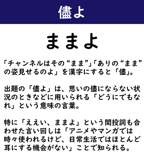 「チャンネルはその“まま”」「ありの“まま”の姿見せるのよ」を漢字にすると「儘」。出題の「儘よ」は、思いの儘にならない状況のときなどに用いられる「どうにでもなれ」という意味の言葉。特に「ええい、ままよ」という間投詞も合わせた言い回しは「アニメやマンガでは時々使われるけど、日常生活ではほとんど耳にする機会がない」ことで知られる。