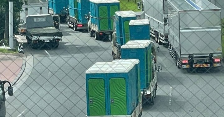 Twitterユーザーのアルシェ(@arcencie)さんが8月12日に「トイレ『が』行列作ってた」というコメントとともに投稿したのは、仮設トイレを載せたトラックがずらりと道路に並んでいる光景。確かにトイレが行列してる……!