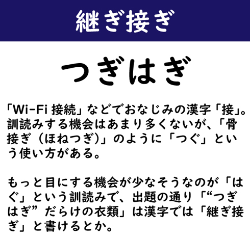 「Wi-Fi接続」などでおなじみの漢字「接」。訓読みする機会はあまり多くないが、「骨接ぎ(ほねつぎ)」のように「つぐ」という使い方がある。もっと目にする機会が少なそうなのが「はぐ」という訓読みで、出題の通り「“つぎはぎ”だらけの衣類」は漢字では「継ぎ接ぎ」と書けるとか。