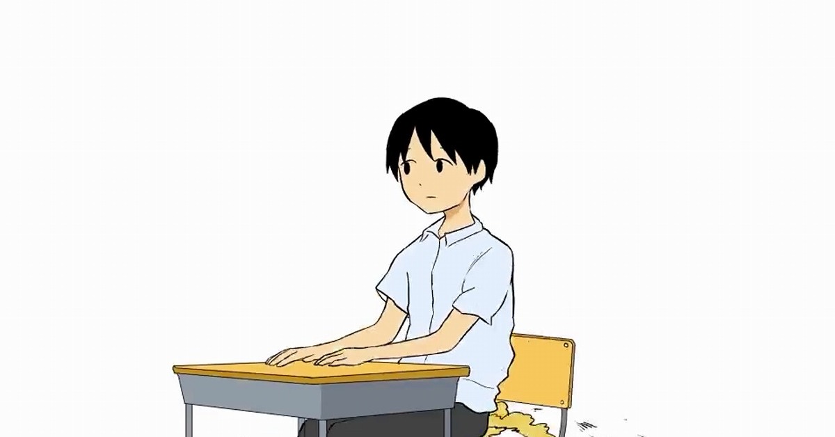 アニメを作成したのは、せなん(@senan0302)さん。まず椅子に座った男子高校生が「うーん、屁が出そうだなぁ」とつぶやきます。続いて「屁、屁、屁が出る3秒前、3、2、1!」という掛け声に合わせ、盛大に放屁しました。