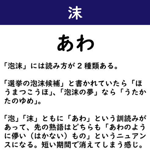 「泡沫」には読み方が2種類ある。「選挙の泡沫候補」と書かれていたら「ほうまつこうほ」、「泡沫の夢」なら「うたかたのゆめ」。「泡」「沫」ともに「あわ」という訓読みがあって、先の熟語はどちらも「あわのように儚い(はかない)もの」というニュアンスになる。短い期間で消えてしまう感じ。