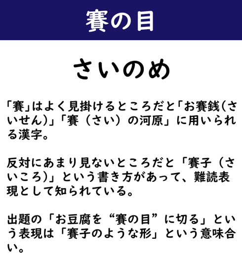 「賽」はよく見掛けるところだと「お賽銭(さいせん)」「賽(さい)の河原」に用いられる漢字。反対にあまり見ないところだと「賽子(さいころ)」という書き方があって、難読表現として知られている。出題の「お豆腐を“賽の目”に切る」という表現は「賽子のような形」という意味合い。