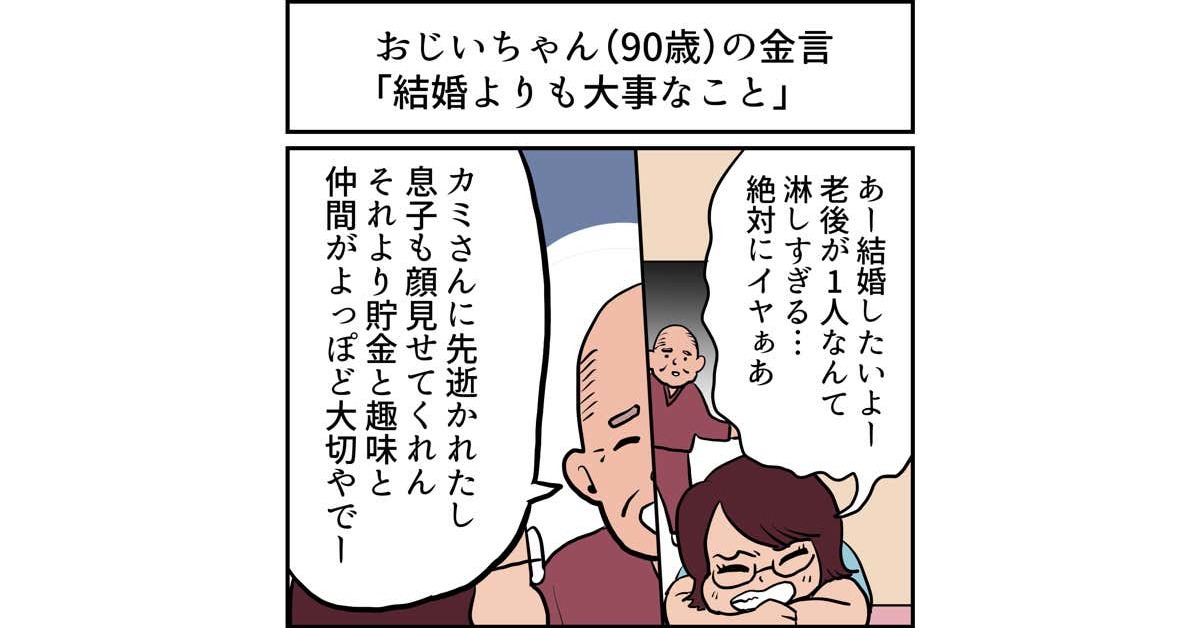 思わずうなずいてしまうツイートを、イラストとともにご紹介する企画「その視点はなかった」。今回は90歳のおじいちゃんが結婚願望がある20代女性に向けて送った、老後についてのアドバイスです。