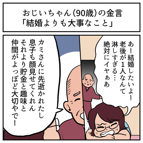 しかしこれに反論するのが、介護を受けている90歳のおじいちゃん。おじいちゃんは妻に先立たれ、息子も顔をなかなか見せてくれないそうです。それだけに結婚しても老後が安心とは限らず、「貯金と趣味と仲間がよっぽど大切やでー」と話すのでした。老後を過ごすにあたって、これもまた重要な視点だよなぁ……。
