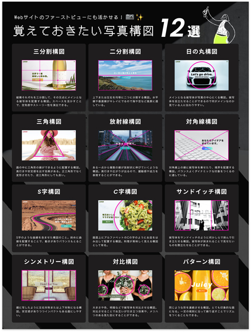 プロのデザイナーによる、「覚えておきたい写真構図」をまとめた画像に反響が集まっています。これを意識すれば、初心者でもセンスの良い写真が撮れるかも。