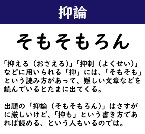 「抑える(おさえる)」「抑制(よくせい)」などに用いられる「抑」には、「そもそも」という読み方があって、難しい文章などを読んでいるとたまに出てくる。出題の「抑論(そもそもろん)」はさすがに厳しいけど、「抑も」という書き方であれば読める、という人もいるのでは。